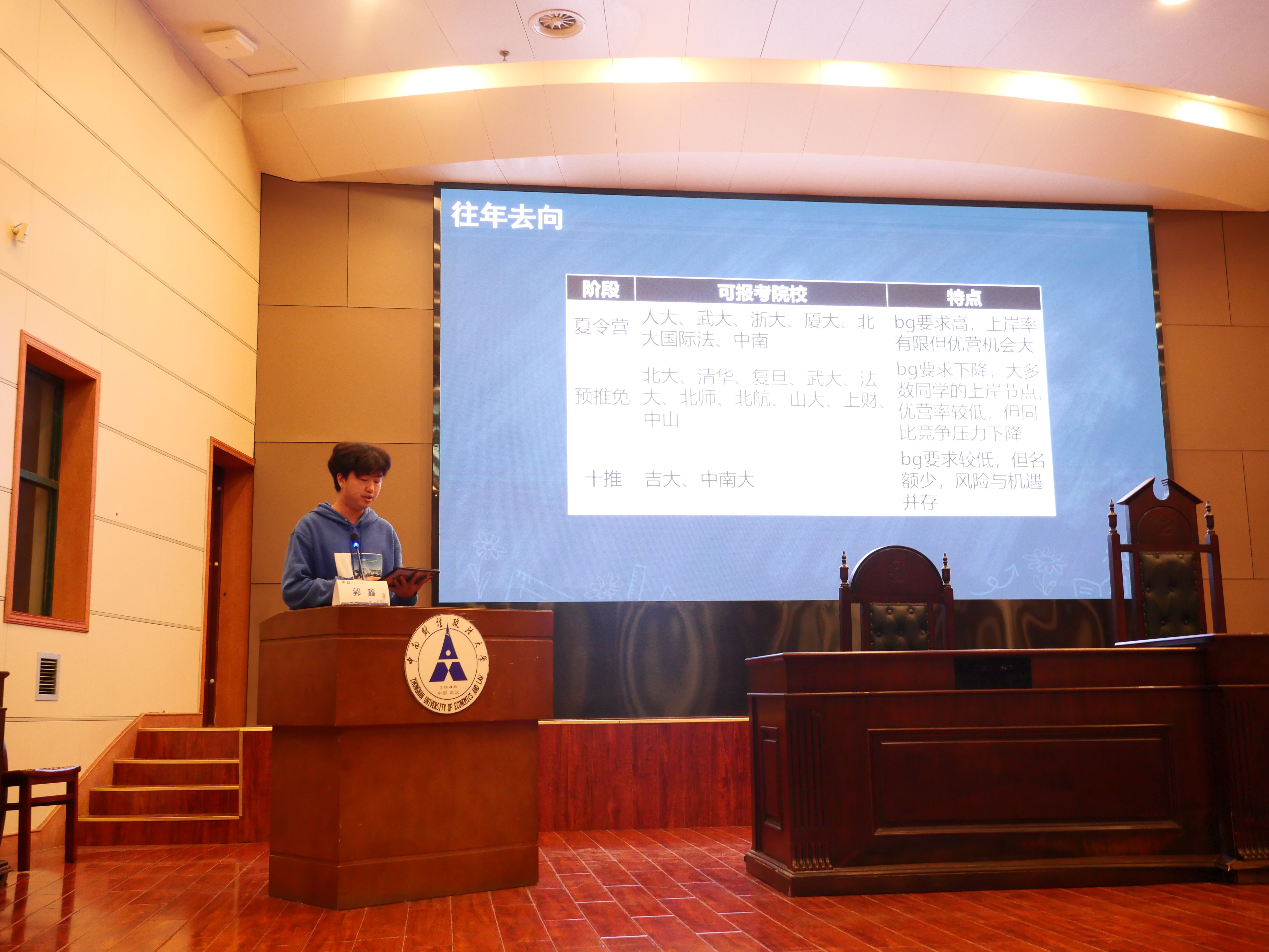新闻网讯(学生通讯员 李佑霖 刘博嵩 徐凌喆)11月14日,tyc234cc 太阳成集团“品茗思刑”优秀学生代表保研经验分享会在文泰楼模拟法庭一成功举行,吸引了太阳成官网各年级大批有深造意愿的同学参与。本次分享会旨在为同学们提供宝贵的保研经验分享,搭建一个交流与学习的平台,助力同学们在保研之路上稳步前行。
