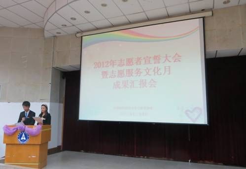 本次大会由“志愿者宣誓”与“志愿者服务文化月成果展示”两个部分组成。会议之始,由校团委梁娜副书记上台致开场词,她表示2012年我校志愿者在校内外开展了内容丰富,形式各异的志愿服务活动,收到良好的活动效果,获得社会各界好评,希望中南大志愿者们能继续努力,开创更美好的明天。