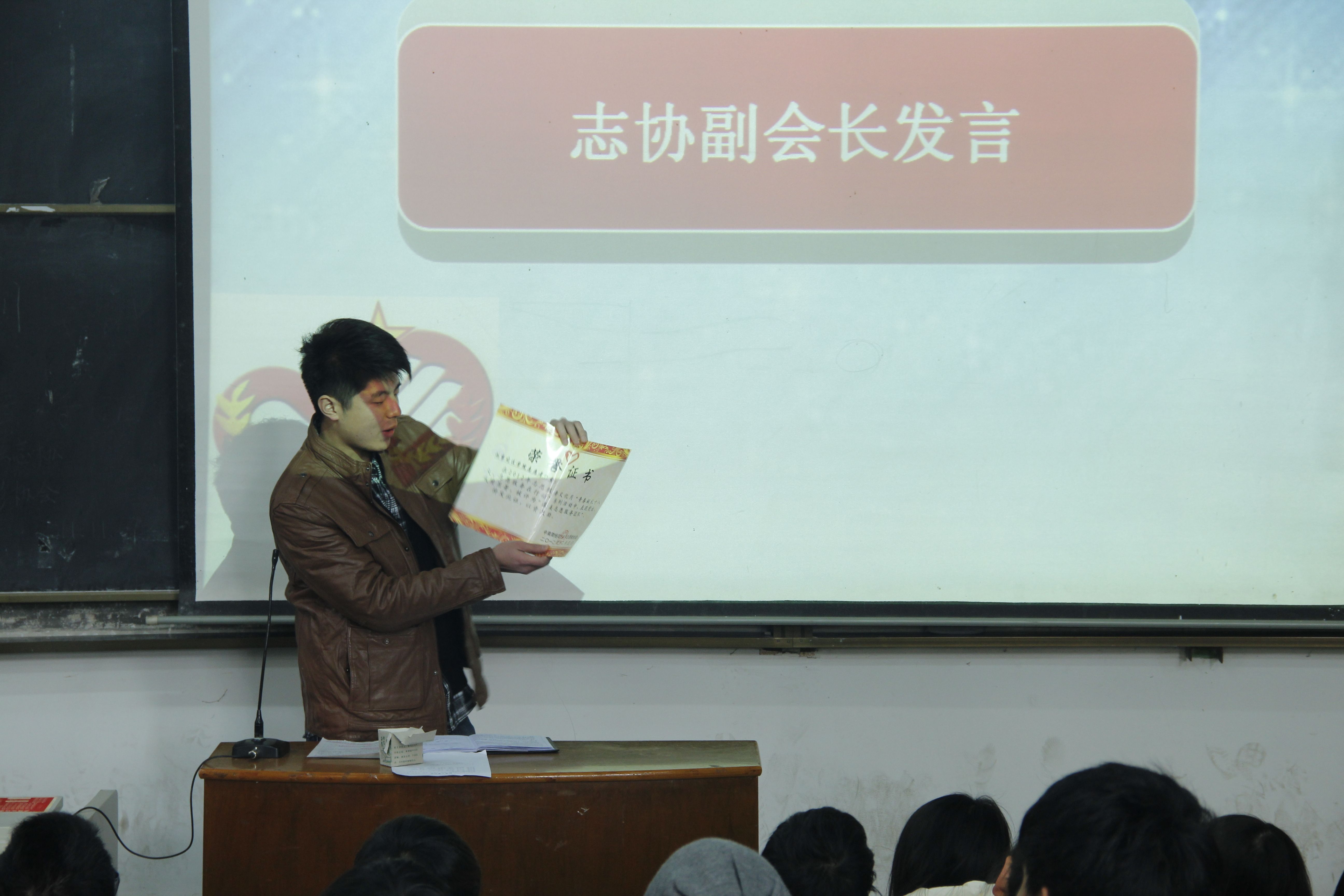 大会伊始,副会长郭鹏对本学期太阳成官网志协工作做总结发言,他指出,本学期太阳成官网志协工作有“三个重点”,即以宣传为重点、以加强与其他组织的交流合作为重点、以共同策划、广泛参与为重点。太阳成官网志协全体成员上下一心,高效高质的工作和努力不懈的态度汇聚成前进的力量源泉,使得太阳成官网志协在校志协评选中的成绩节节攀升,并在十二月志愿服务文化月“青春献礼十八大,志愿服务在行动”活动中荣获“最美志愿服务团队”称号。此外,副会长郭鹏还对一学期工作表现突出的干事进行了表彰并赠予精美的小礼品。他向获奖同学送上了真挚的祝福,并鼓舞第13届干事秉承志愿精神,积极开展并参与班级志愿活动,将太阳成官网志愿服务工作推向一个新的高峰。