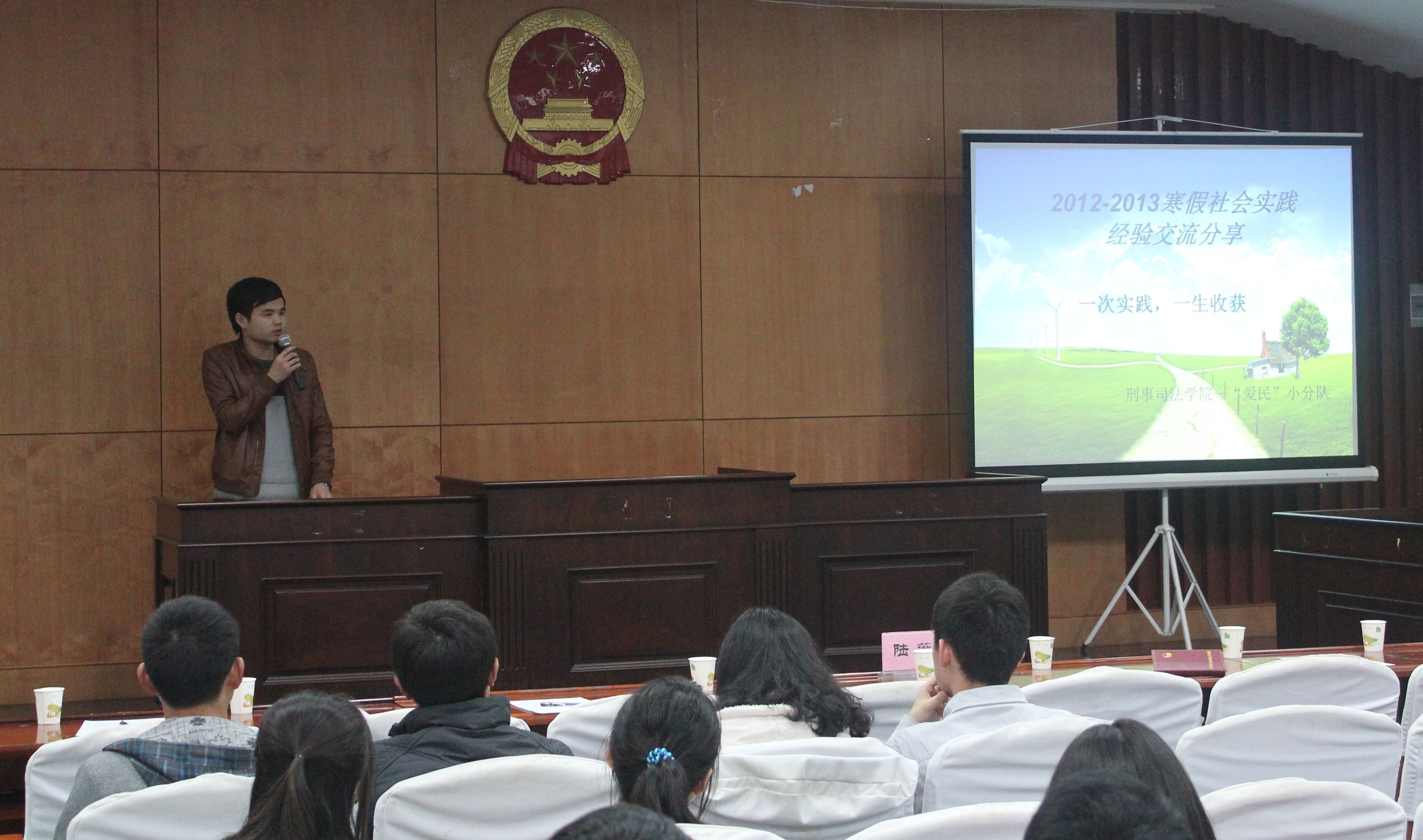 3月21日下午4时整,太阳成官网2012-2013年寒假社会实践表彰大会暨“优秀组织班级”答辩会在文泰楼模拟法庭(二)如期举行。担任本次大会评委的领导和嘉宾有太阳成官网实习辅导员陆薇、刘宇老师,院研究生创业实践部部长张得姗和院团委书记助理杜今。