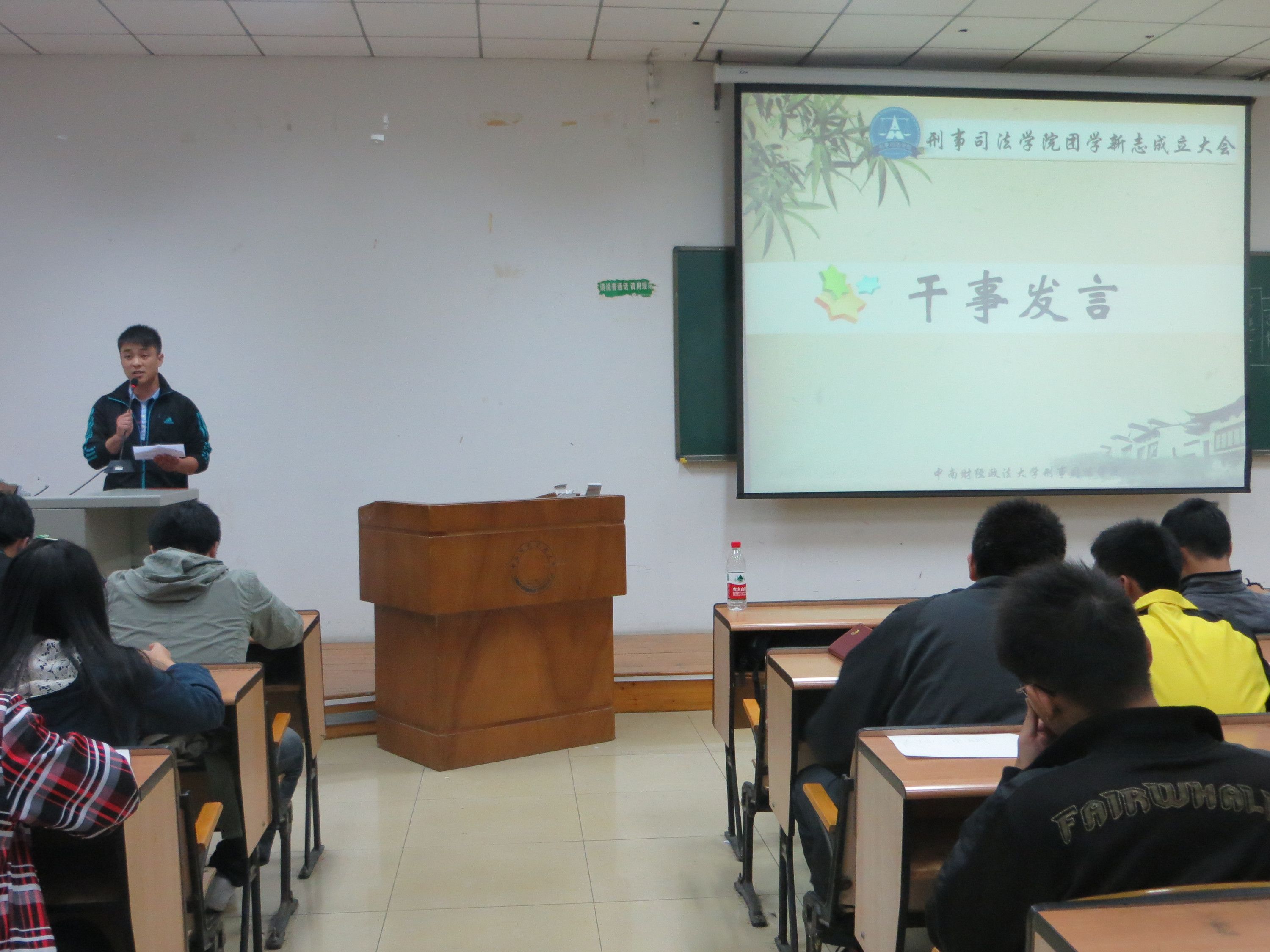 随后,由来自侦查1301班的新生黄珊珊代表新生干事发言。其诙谐的开场白让大家忍俊不禁,会议气氛顿显活跃。黄珊珊同学首先提出了自己对于团学新志新干事工作的见解,强调新干事要增强集体意识。随后他从学习、责任等其他四个方面详细阐述了新干事们的工作要点,并表明会与刑司所有干事一起努力,为刑司书写更为辉煌的篇章。