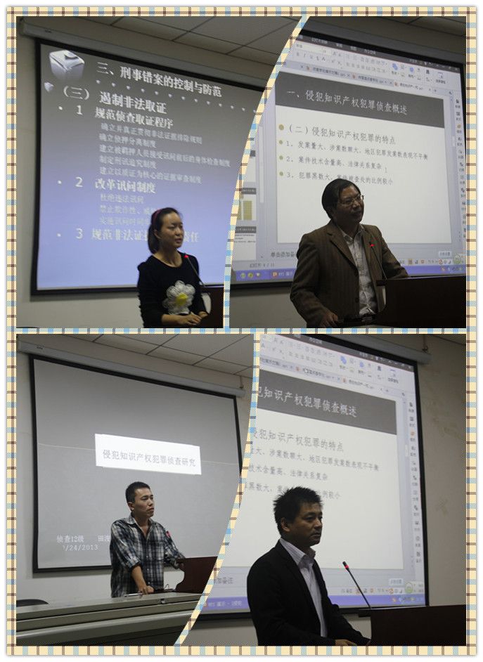 周睦棋老师首先向到场的老师与同学们致辞,并宣布了第四届侦查学社学生团体负责人名单。随后侦查学社第三届学生团体负责人代表季恒和第四届学生团体负责人代表李占奎分别致辞。学术报告环节中,向雪莲首先以“刑事错案的成因与对策分析”为主题开始了自己的演讲。她从学界对刑事错案定义的争议开始,提出自己的认识;并认为解决刑事错案的当务之急是找出引发刑事错案的自身弊病和司法缺陷。紧接着,田浚箐同学以“侵犯知识产权犯罪侦查研究”为主题,以非法制造、销售非法制造的注册商标标识案为例分析了侵犯知识产权案件的侦破难点和侦查要点,并提出自己对于此类侦查工作的完善意见。