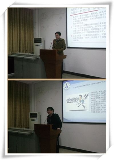 本次活动围绕“民意与司法活动的互动”为主题展开讨论,由南湖青年刑法沙龙现任主席崔仕绣主持。在第一个环节中,由2013级刑法学硕士研究生徐小明、孙杰两位同学主讲,他们分别从理论和实践的角度对此次主题进行了阐释。徐小明同学从何为民意、互动影响、民意与刑事司法的博弈、原因探讨及争议立场四个方面进行了讲述,论理充分,逻辑清晰,观点新颖,特别是他认为民意是一柄双刃剑应当有限度的纳入司法中的观点,得到了苏老师极大的认可和支持。孙杰同学从民意与死刑废除的问题、民意与两商司法解释的互动、民意与法官裁量权范围的互动三个方面进行了讲解,立意鲜明,案例丰富生动,分析透彻。在讨论环节中,同学们积极发言,两位主讲人也相继表达了自己对其他同学提出的问题得看法,周凌老师也就自己对“严打”及相关的民意问题向同学们作了自己观点的阐述和讨论。大家针锋相对,讨论热烈,将此次活动推向高潮。在最后的环节中,苏彩霞老师首先进行了总结发言,她肯定了两位主讲人的选题及讲述内容,并提出了对民意进行立法和司法两阶层分析的观点,给同学们开辟了另一种思考角度。丁友勤老师提出了自己对于民意与司法互动的看法,她认为民意对刑事案件的影响是很盲目的,并且就个案而言对其影响也不合理,同时也对两位主讲人的表现给予了很高的赞扬。童德华老师对此次主题的选取给予了极大的肯定,他认为民意应不应该对司法产生影响首先要看民意是否是理性的而不能说是情感问题,引古至西,并且从后现代法学中公平正义的标准的选取之难等方面进行了具体的分析和深入,发人深思。周凌老师则从英美法系和大陆法系在司法中对正义追求的不同的角度进行了剖析切入,然后也结合我国的实际情况进行了比较分析,以及研究流、政治流、问题流三个方面对司法实践的影响,开阔了同学们的视野,丰富了同学们思考问题的角度。最后,主持人崔仕绣同学对老师们以及同学们的发言进行了总结归纳,宣布此次活动圆满结束。
