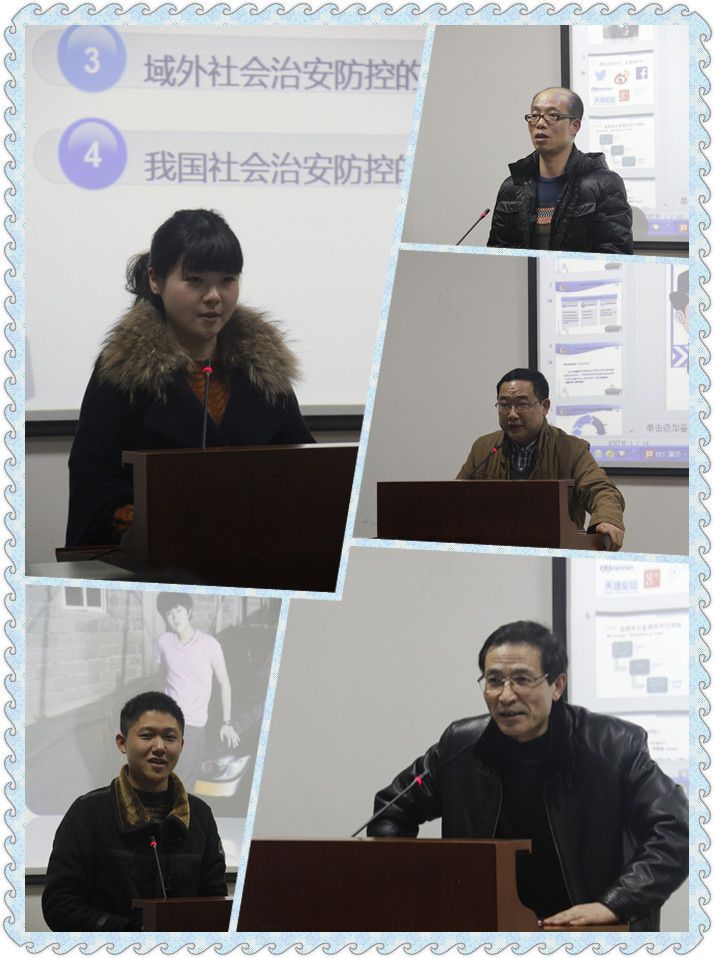 活动开始由杨立云副教授致辞,他风趣的开场白迅速活跃了现场的气氛。随后,开始了第一场学术报告,吴念以“社会治安防控中的困境与对策”为主题开始了自己的演讲。她从各方面分析了当前社会治安防控方面的问题,提出自己的分析和见解,并且全面丰富的提出了解决社会治安防控困境的对策。演讲结束后,同学们、老师们对该主题报告进行积极提问并与之交流,针对报告交流的主题,董少平教授对吴念的报告进行了点评。董少平教授首先对报告内容的丰富全面进行了肯定,并针对报告中的部分内容提出修正补充,希望“大治安防控”工作再上一个台阶。紧接着,孙浩凯以“自媒体时代侦查工作面临的机遇与挑战”为主题开始了第二场演讲,他详细的介绍了自媒体时代的含义及其对侦查活动的影响,以新的视角从各方面分析了自媒体时代侦查的机遇和挑战,令人耳目一新。在老师们、同学们积极提问交流后,彭峰副教授对孙浩凯的报告进行点评,他高度赞扬了报告主题的新颖性,并提出了一些修改意见,希望同学们更加深入的研究探讨问题。