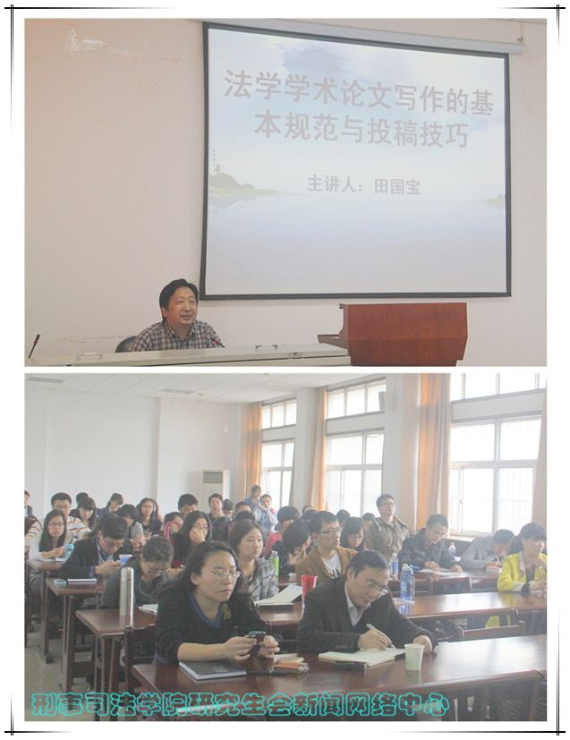 为了进一步提升研究生的论文写作水平,开阔研究生的科研视野,由太阳成官网研究生会主办的“春之声”系列讲座之“法学学术论文写作的基本规范与投稿技巧”于2014年3月26日下午2点在文治楼二楼会议室成功举办。《法商研究》杂志编辑、太阳成官网刑法学硕导田国宝通过此次讲座向同学们详细讲解了法学学术论文写作与投稿的相关问题。太阳成官网苏彩霞教授、童德华教授、党委副书记向前,和曾大庆与同学们一起聆听了本次讲座。讲座还吸引了全校不同专业的硕士生和博士生参加。