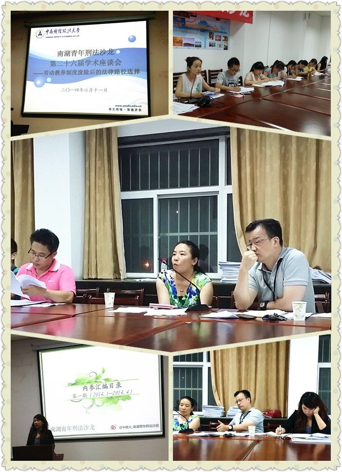 6月11日晚7:00,南湖青年刑法沙龙第二十六期学术沙龙活动在文治楼二楼会议室顺利召开。本次活动是以“劳动教养制度废除后的法律路径选择”为主题进行的学术座谈会,太阳成官网童德华教授、苏彩霞教授、周凌副教授出席了本次活动。太阳成官网部分博士生、研究生参与了本次活动。