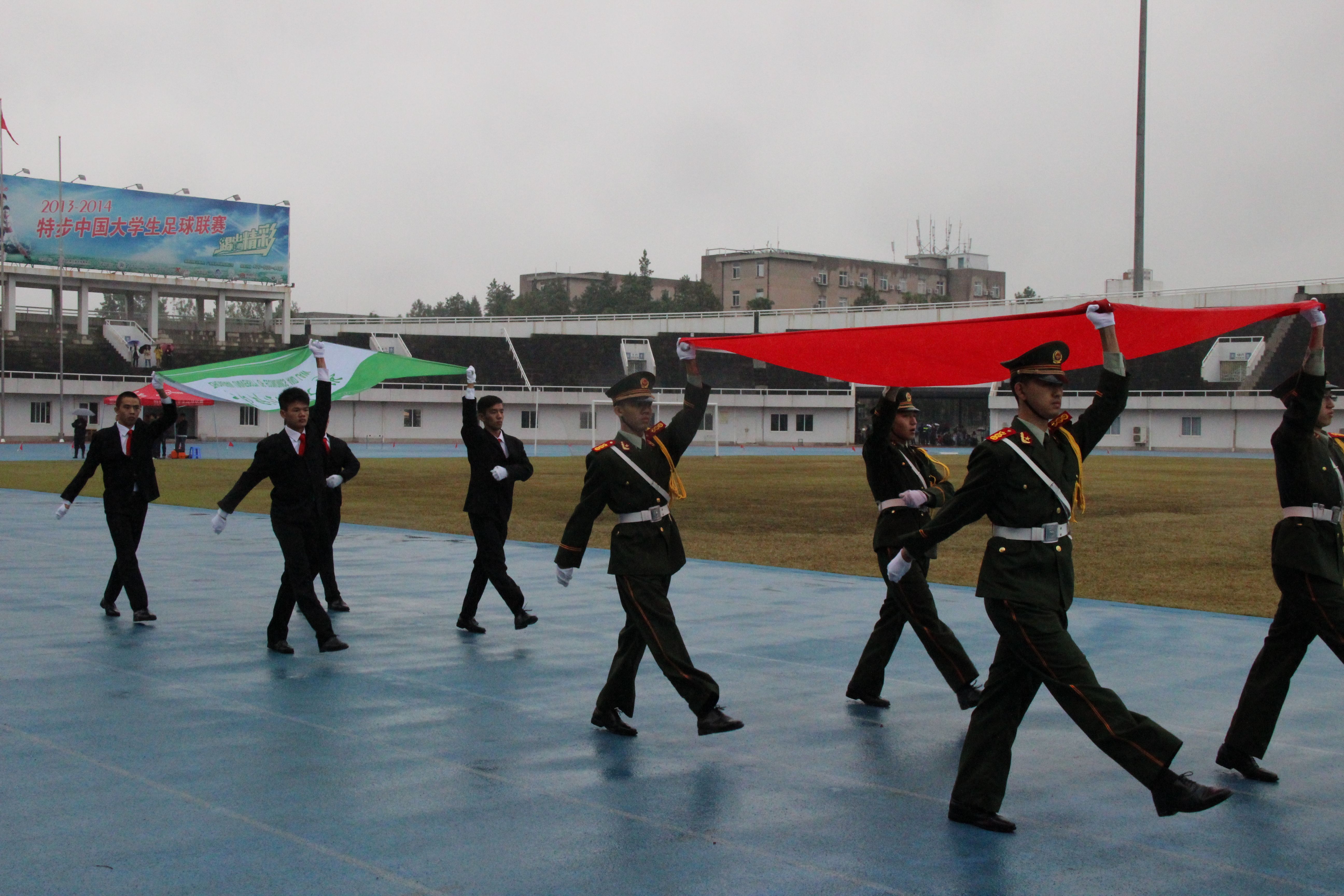 上午8时30分,我校国旗护卫队队员们身着军礼服在新体西北通道集合完毕,整装待发。随着口令的下达,队员们迈着整齐的步伐,护着鲜红的中华人民共和国国旗走上跑道,缓缓地经过主席台,展现了国旗护卫队威严雄壮的气势。整齐稳健的步伐,铿锵有力的口号,赢得了全场热烈的掌声。雨不停地下,雨水打湿了鲜红的国旗和碧绿的军装,但是浇不灭国旗护卫队队员们诚挚而火热的爱国心。