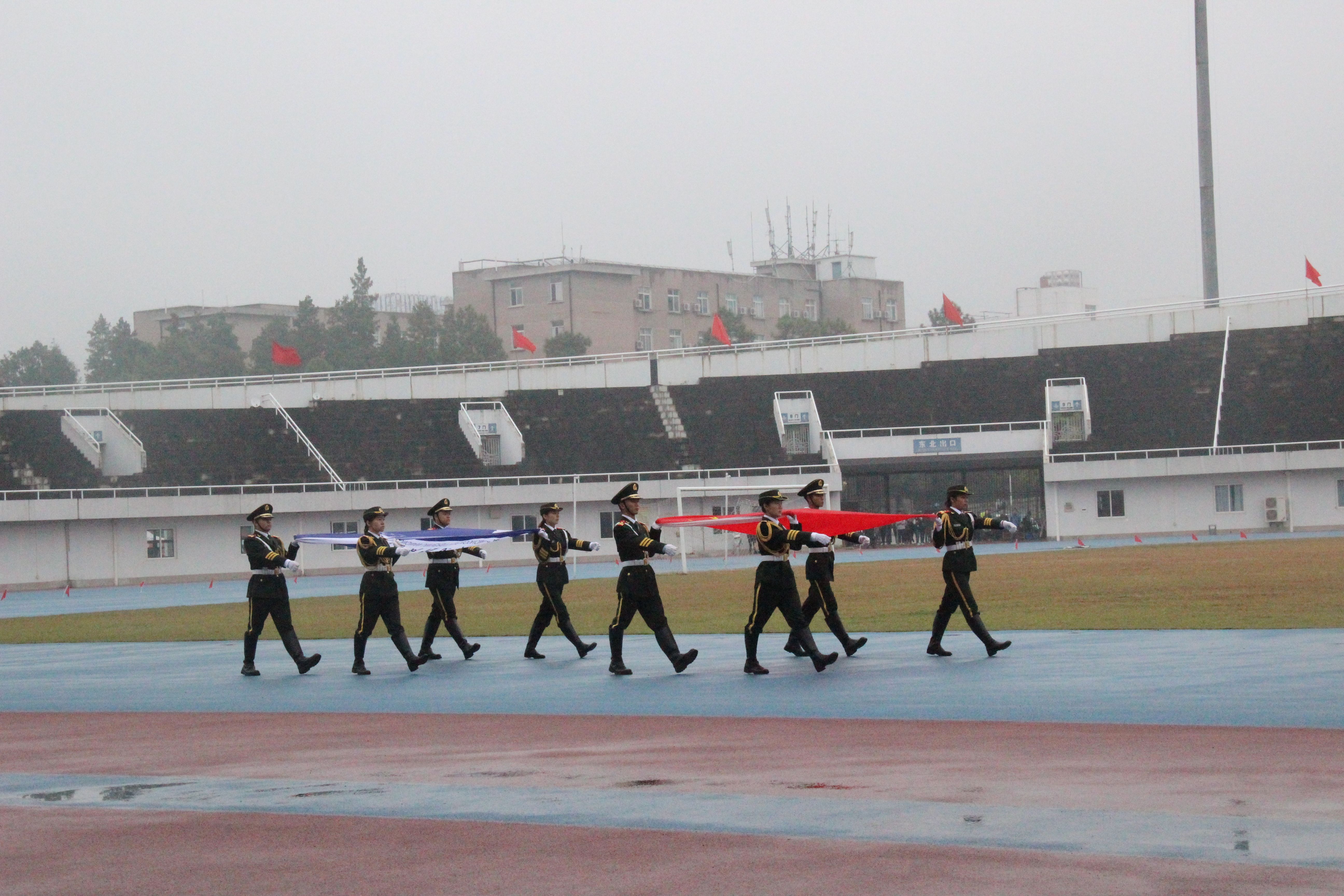上午8点30分,身着威严军礼服的国旗护卫队准时出现在新体。伴着庄重的奏乐声响,鲜艳的五星红旗和tyc234cc 太阳成集团校旗在队员的护卫下缓缓前行。雨越下越大,队员们步伐却依旧整齐划一;风越刮越猛,队员们口号依旧铿锵响亮。他们精彩的表现,博得了全场的热烈掌声,更触动了每一位同学诚挚的爱国心。
