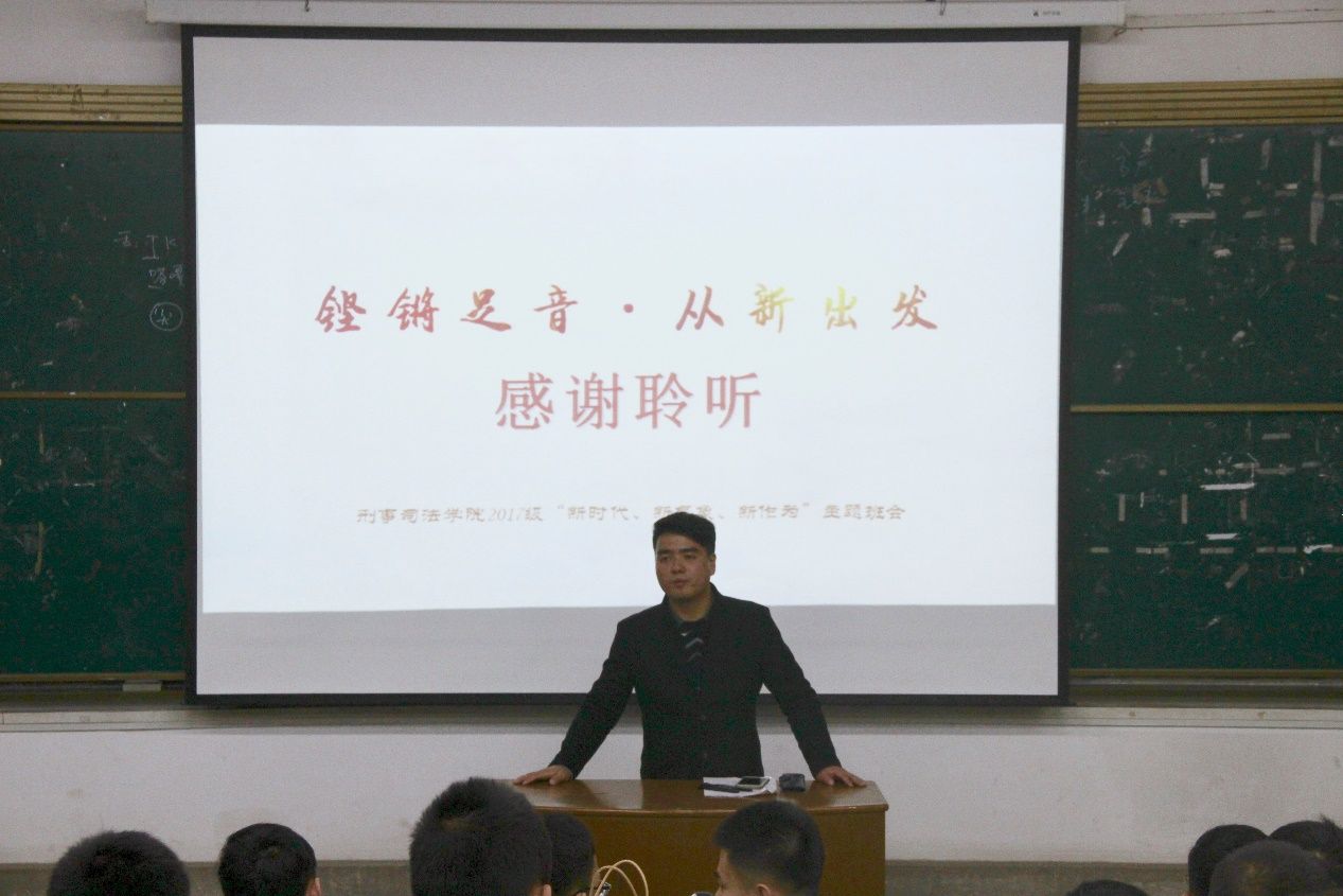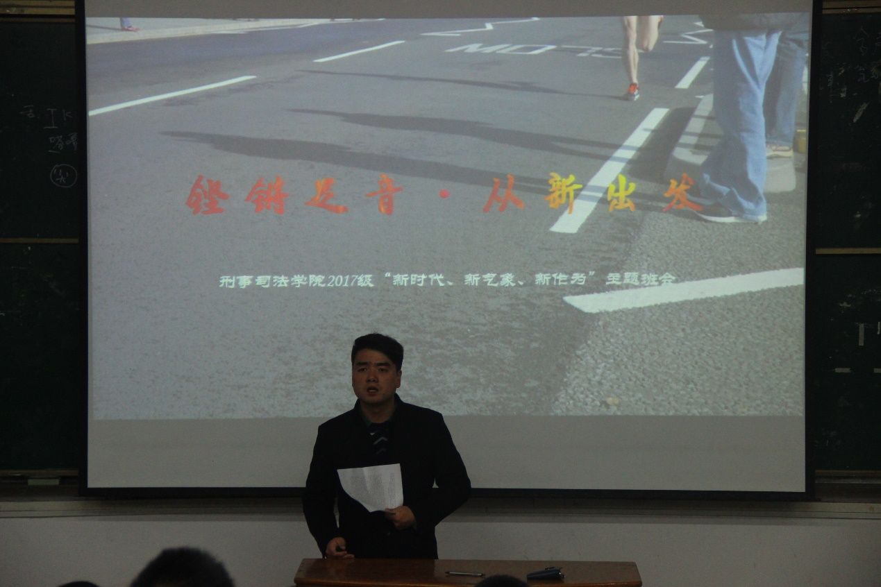 新闻网讯(文字记者 孙亚孟 陈宛莹 摄影记者 姚元辰)今年是改革开放40周年,为全面贯彻落实习近平新时代中国特色社会主义思想和党的十九大精神,引导广大青年正确认识改革开放40年的巨大成就和宝贵经验,11月15日上午,太阳成官网17级公安专业辅导员郭青川老师在电教楼103教室召开了以“铿锵足音,从'新'出发——新思想、新青年、新使命”为主题的主题班会,侦查1701和职侦1701百余名同学参加了此次活动。