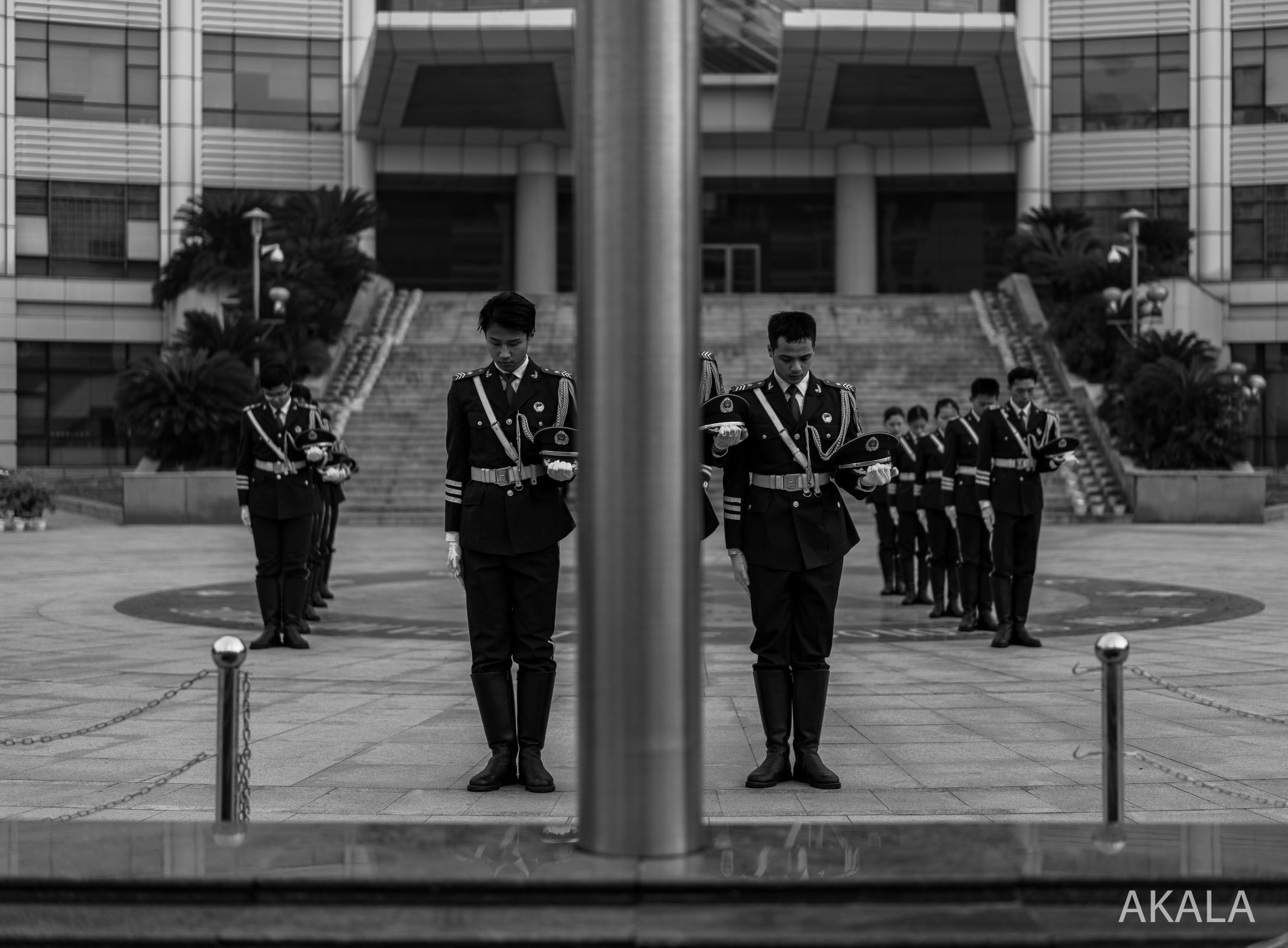 升旗仪式结束,观礼全体师生、国旗护卫队全体队员在国旗台前,为为国捐躯的将士们、不幸丧生的同胞们脱帽默哀一分钟。