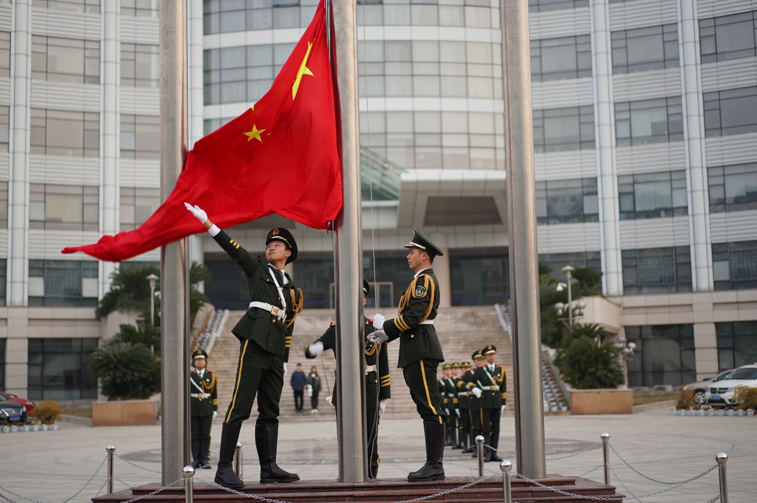 早六时五十五分,我校国旗护卫队准时从文治楼列队出发,于七时五分到达青云桥。队伍到达国旗台后,在口令员的指挥下,分列旗台两侧,升旗仪式正式开始。国歌在中南楼前的广场上响起,随着一声“敬礼”,国旗缓缓升起。观礼师生行注目礼,有经过的路人驻足观礼。