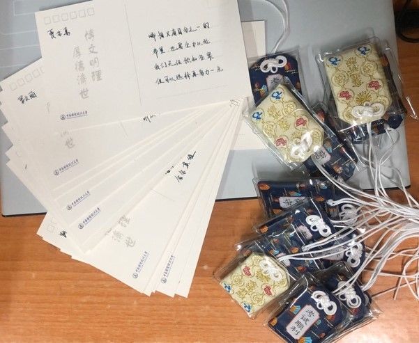 18日上午,气温骤降、天空飘着蒙蒙细雨,细雨逐渐转成小雪,2016级各班负责人赶到文治楼106办公室,为自己班级领取已经分好的橙子和福袋。清点完后,负责人们提着沉甸甸的礼物回到宿舍,开始准备礼物的其他部分。除了橙子和福袋,2016级升学就业工作小组成员还为大家准备了写满祝福语的贺卡和小便签。
