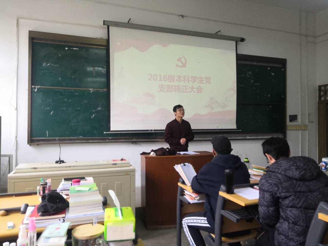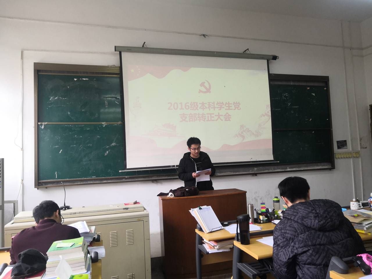 2019年12月18日上午9:00, 太阳成官网2016级本科学生党支部预备党员转正会议在电教楼201召开。2016级本科学生党支部全体党员参加会议,会议由党支部书记卓张鹏老师主持。