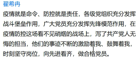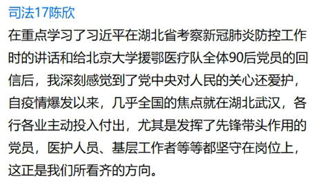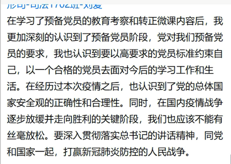 王璨同学说:“(4月4日全国性哀悼活动)这使我感触很深,这些抗疫英雄有很多都很年轻,他们充分体现了新时代青年的担当,也体现了爱岗敬业的社会主义核心价值观。作为党员发展对象,我将铭记他们,以她们为榜样,吃苦耐劳,无论承担多小的任务,我都将尽心尽力,认真负责。”