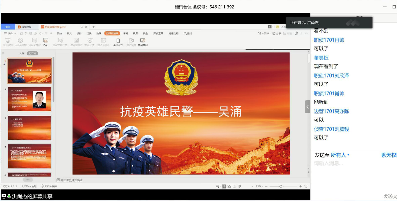 职侦党小组洪尚杰同志分享了吴涌烈士的故事。新冠肺炎疫情发生以来,吴涌全力以赴做好社区封控、患者转运、服务群众等工作,在社区抗疫第一线连续奋战61天。2020年3月22日,在抗击疫情一线工作岗位上因公殉职。洪尚杰同志说:“他作为一名基层民警,又是一位党员干部,是我们公安专业同学的精神榜样,其事迹是我们日后参与工作时的标杆,我们要以吴涌烈士的事迹时时刻刻检验自己是否达到作为一名党员干部、一名人民警察的标准,为我们日后的工作生活指明方向。”