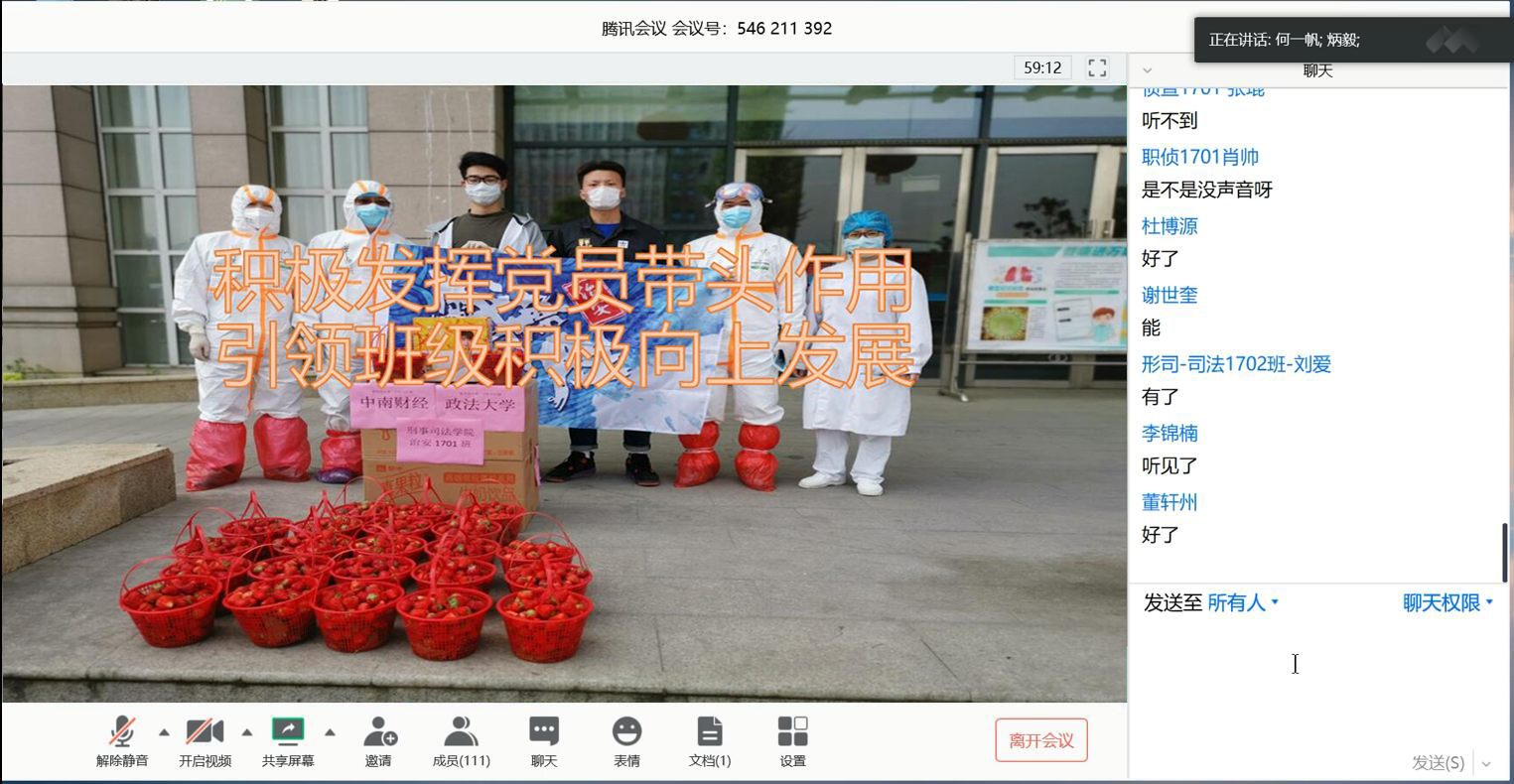 付政和李毅同学分享了他们在抗疫一线参加志愿服务的故事,他们冒着随时会被感染的风险,主动向党组织申请抗击疫情,挺身请战,以实际行动践行了入党的初心和使命。