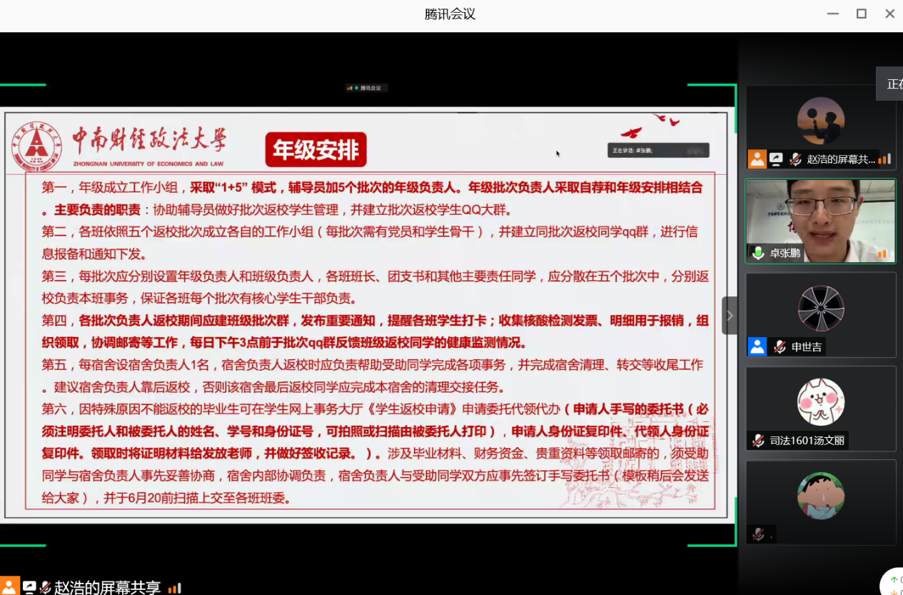 其次,卓张鹏老师对返校前后的年级工作进行了安排。他提出五点要求,一是年级成立“1+5”模式的返校工作小组,协助辅导员统筹年级返校事务;二是各班依照五个批次成立各自批次的工作小组并建立QQ群;三是各批次应设置负责人,组织学生健康打卡、领取材料、反馈学生健康动态等;四是各宿舍设置宿舍负责人,帮助不返校的同学代领代寄,并完成宿舍清理转交等工作;五是委托同学与宿舍负责人应签订含有个人身份信息的手写委托书,保证重要材料领取、个人物品邮寄的安全妥当。
