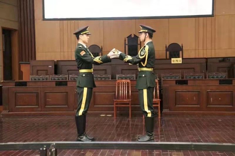 新队长第十九届队长马一新从刘嘉斌手中接过指挥刀,也意味着从此接过了领导队伍继续前进的职责,他带领全体20级新队员面向国旗,庄严宣誓。“护卫国旗、重于生命”的誓词在会场久久回响,相信新队员们必定严守誓词,在接下来的训练以及任务中展现自己的风采。