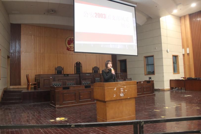 随后,公安2004班班长刘孟坦代表公安2004团支部进行展示。幽默风趣的语言与生动的讲解给现场的评委观众们留下了深刻的印象。同时,也特别介绍了班级班规班风与文化建设,展现了青年大学习的积极性。最后,通过三次形式各异团日活动展现了班级特色工作的活力。公安2005团支部书记窦媛媛用精美的PPT介绍了班级五大方面的工作,明确了班级的宗旨,介绍了特色的班级活动,列举了班级在竞赛和才艺层面所获得的奖项,并通过极具特色的视频回顾了班级半年以来的建设历程。